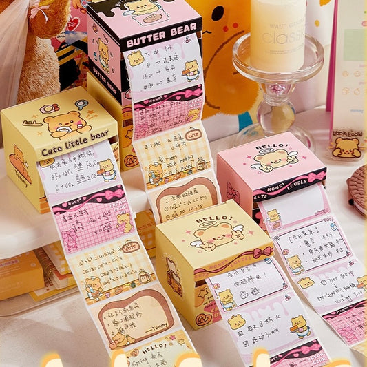 128 pcs/Set Butter Bear Sticky Full Adhesive Notes Roll Tape with Pull Out Dispenser Box